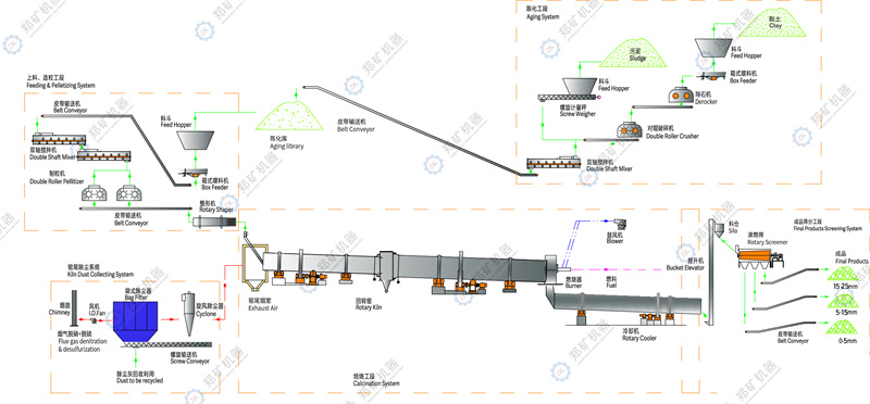 陳化后的混合料被鏟車送到料倉,然后經過雙軸攪拌機攪拌后,送到對輥造粒機擠壓制粒。產出的顆粒料球由皮帶輸送機送入整形篩分機,圓整處理后,小顆粒被篩出,合格的顆粒球被送入雙筒插接式回轉窯進行預熱和焙燒。燒制出的陶粒成品落入冷卻機冷卻后,再由回轉篩分成5mm、15mm、25mm三種規格的成品,各自存放在堆場存放,裝袋后發貨。冷卻機內冷卻陶粒的自然空氣被加熱到500℃進入到回轉窯內輔助燃燒,可以節約大量的燃料。可以采用稻殼或其他種類的燃料,粉碎后的燃料被高壓風機送入回轉窯內燃燒。窯尾的含塵高溫煙氣進入空氣冷卻器降溫后,進入袋收塵器凈化后排空。