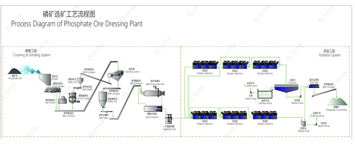 在對于磷元素的提取過程中,我們需要將大塊的磷礦石破碎、研磨成細粉,因此在選礦的過程中,就需要使用破碎機和球磨機這兩種類型的設備。研成粉末以后的磷礦由于磷礦石可浮性都比較高,還需要借助浮選機等進行選別,由此可知:磷礦石選礦流程主要包括:破碎篩分、磨礦、浮選、脫水、尾礦處理幾個階段。不同階段處理流程不同,使用的設備也不同,下面就來對于這些階段進行分析。1、破碎篩分階段:這一階段主要是將大塊的磷礦破碎成小塊,破碎的時候,需要采用二級閉路或三級閉路工藝將0-350毫米的大塊磷礦破碎至15毫米以下的小顆粒物料,然后才能進行后續的粉磨作業,這一階段的篩分作業,主要是為了保證破碎后的磷礦石顆粒均勻且都符合15毫米以下的要求;